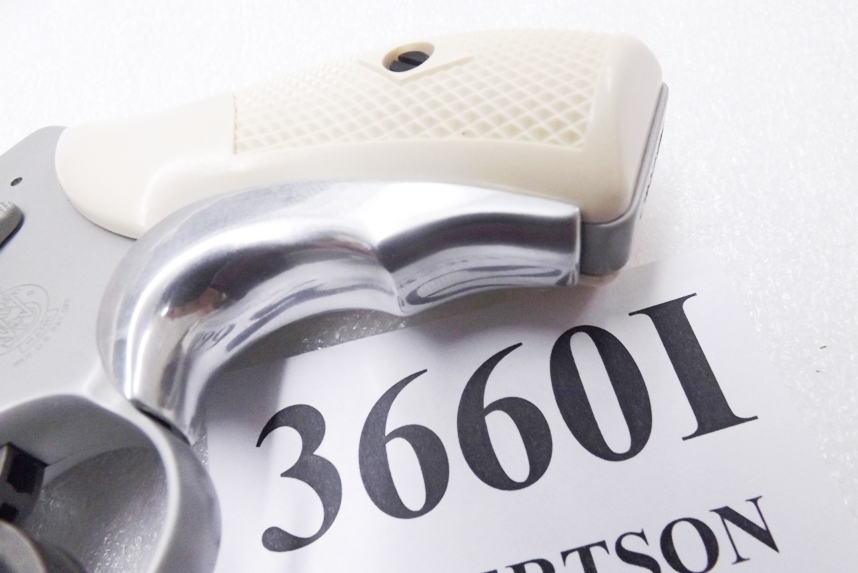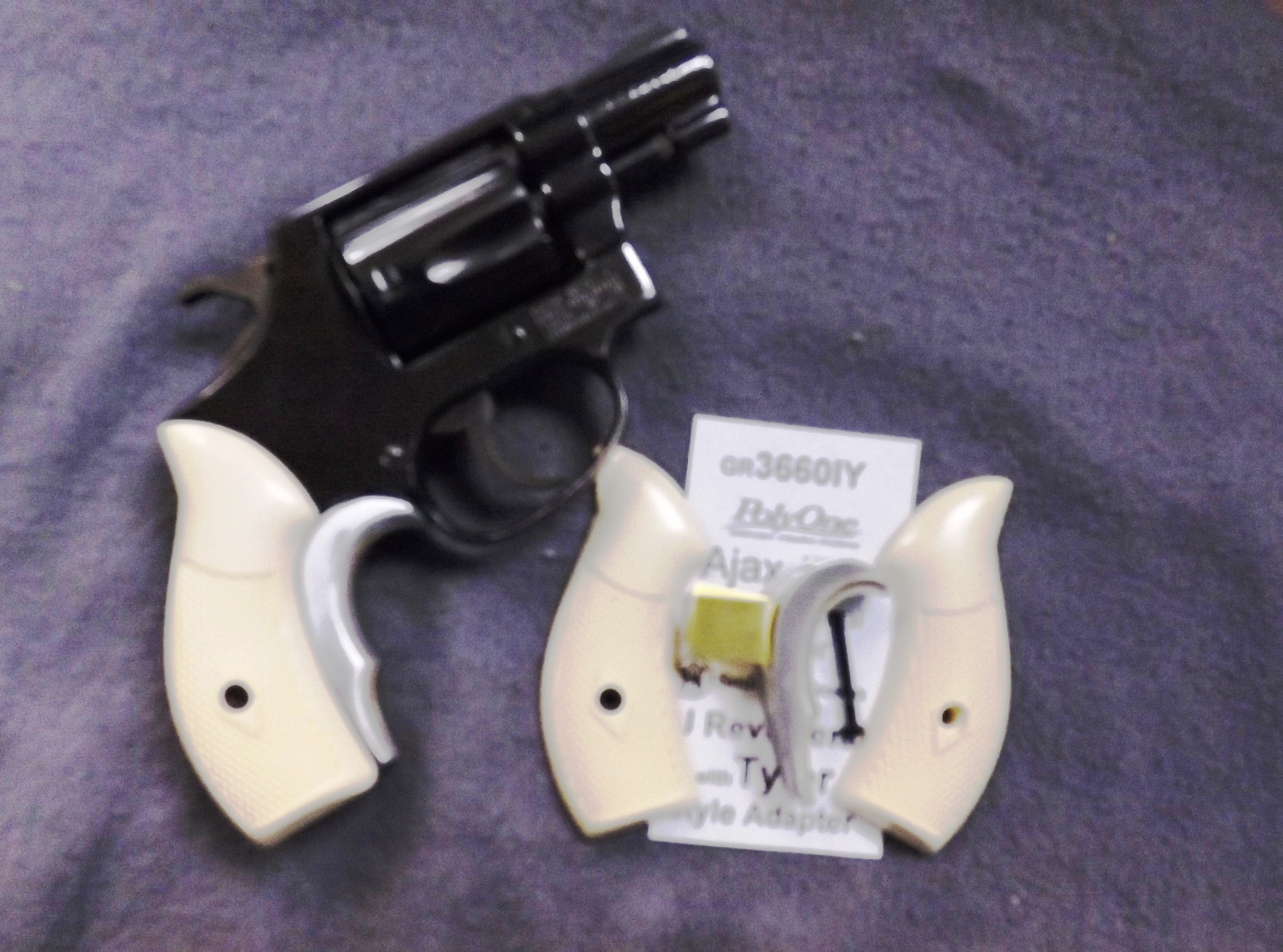 This listing is for two components: One set of grips and One Grip Adapter. They restore compactness and 1970s aesthetics to Smith & Wesson Pocket Size Revolvers known as the J Frame Series with Round Butt Grip frames. That includes models 30, 32, 33, 34, 36, 37, 38, 40, 42, 49, 51, 60, 63, 317, 351, 442, 637, 638, 640, 642, 650, and 651. Grips type is Magna or Service size standard panels. This set includes a Tyler style Grip Adapter that increases front strap size and ergonomics, and reduces recoil torque. Construction is brushed surface aluminum alloy, with brass center stirrup that attaches between grip panels and frame. Grips are exact copies of the old Ajax 22IP series, hard polymer with checkered texture lower panels. Screw is flat head steel, with black brass escutcheon in the right panel. Grip finish is semi gloss imitation ivory. These grips and adapters will only fit Smith & Wesson small J Frame Revolvers with a round butt grip frame. They are period correct for revolvers made between World War II and the onset of internal locks in 2002. Photo model, in fact, was a 1969 Terrier model 32-1 from Cold War Air Service. Each grip pair and adapter comes in its individual package suitable for reseller pegboard display.