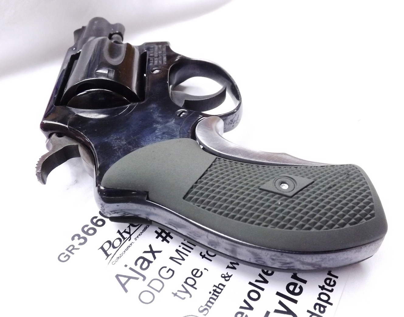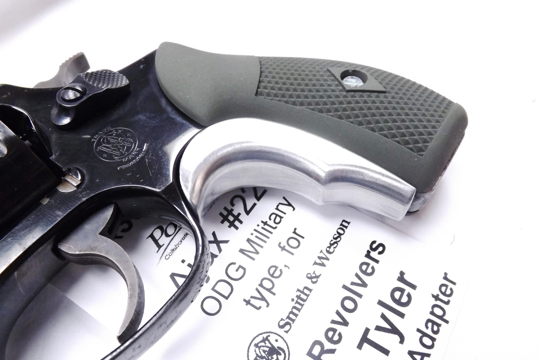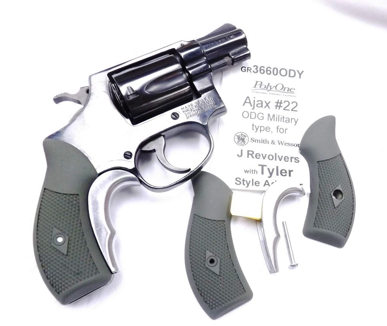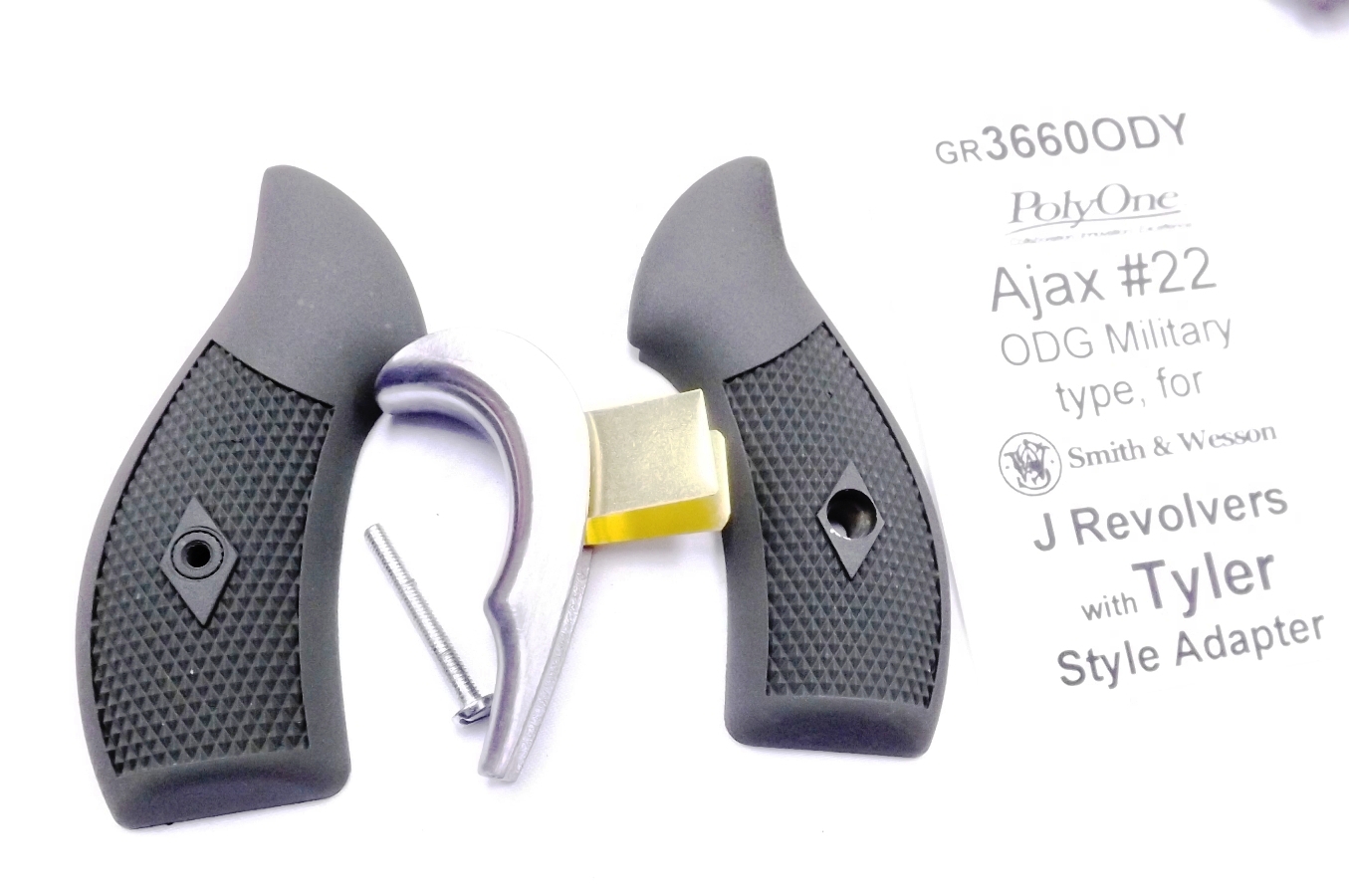 This listing is for two components: One set of grips and One Grip Adapter. They restore compactness and 1970s aesthetics to Smith & Wesson Pocket Size Revolvers known as the J Frame Series with Round Butt Grip frames. That includes models 30, 32, 33, 34, 36, 37, 38, 40, 42, 49, 51, 60, 63, 317, 351, 442, 637, 638, 640, 642, 650, and 651. Grips type is Magna or Service size standard panels. This set includes a Tyler style Grip Adapter that increases front strap size and ergonomics, and reduces recoil torque. Construction is brushed surface aluminum alloy, with brass center stirrup that attaches between grip panels and frame. Grips are exact copies of the old Ajax 22IP series, hard polymer with checkered texture lower panels. Screw is flat head steel, with black brass escutcheon in the right panel. Grip finish is Military Style Olive Drab Green Krylon matte coating. These grips and adapters will only fit Smith & Wesson small J Frame Revolvers with a round butt grip frame. They are period correct for revolvers made between World War II and the onset of internal locks in 2002. Photo specimen, in fact, was from Air Service issuance at Ramey Air Force Base in 1969. Each grip pair and adapter comes in its individual package suitable for reseller pegboard display.