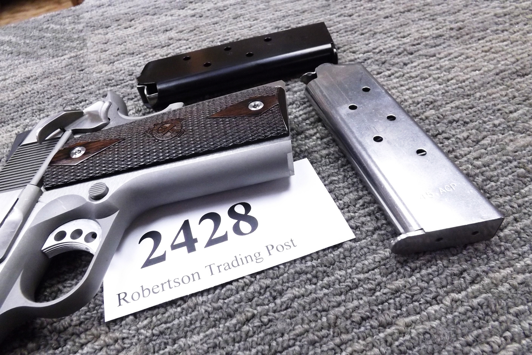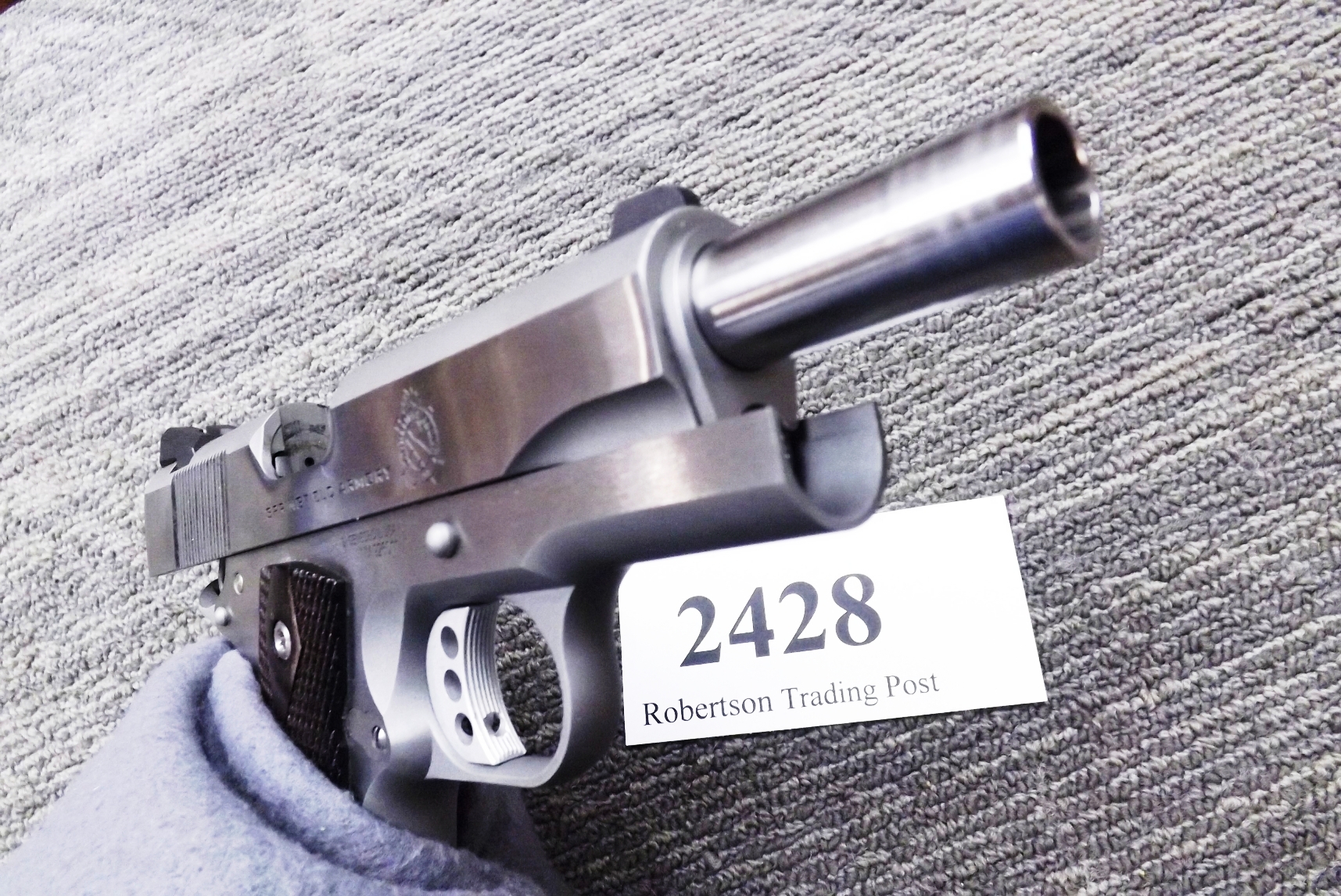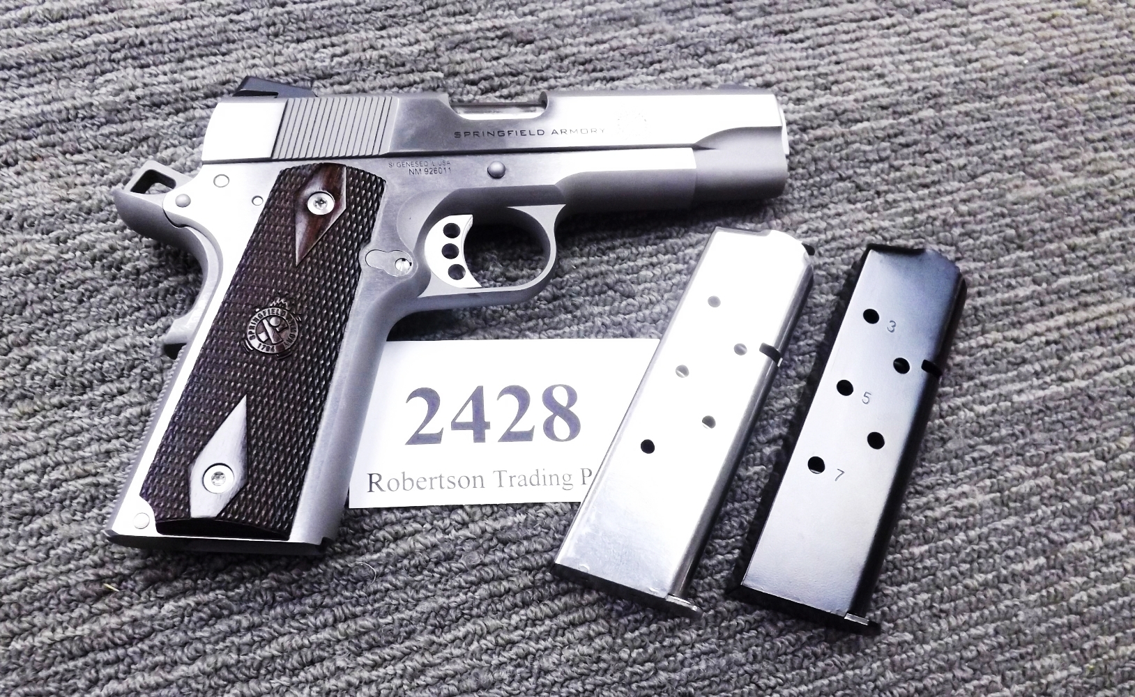 Exact pistol in photos. Springfield Armory Garrison, Steel Frame Commander Size pistol. Springfield Armory Geneseo IL, 2024 production, NM926000 range serial. Entirely steel construction except alloy ckeleton trigger with overtravel set and wrench included. 4 1/4 inch hammer forged barrel. Traditional bushing. Standard Recoil system. Low Profile Dovetailed 3 dot combat sights. Furnished with Factory stainless 7 shot and blue 7 shot magazines. Height 5.5 in; oal 7.9 in; 33 oz empty. Thinline diamond checkered factory hardwood grips with SA logo sculpted. Brushed stainless laterals, matte verticals. Beavertail grip safety, extended left side lever safety. Retiree owned, minimal wear, disassembly streak. We estimate fired fewer than 200 rounds. In original box with zipper case, trigger wrench, Springfield Lock, chamber protector, Instruction Booklet with never executed factory registration and SA decal.