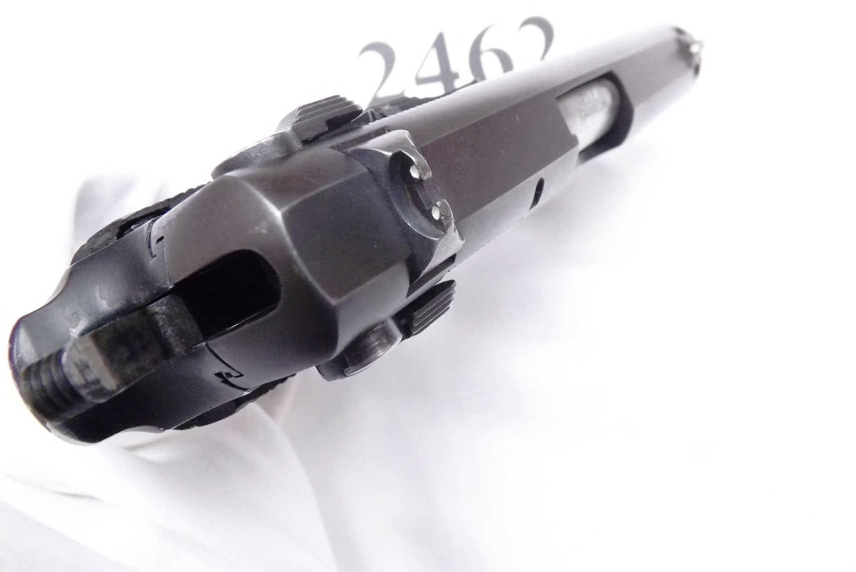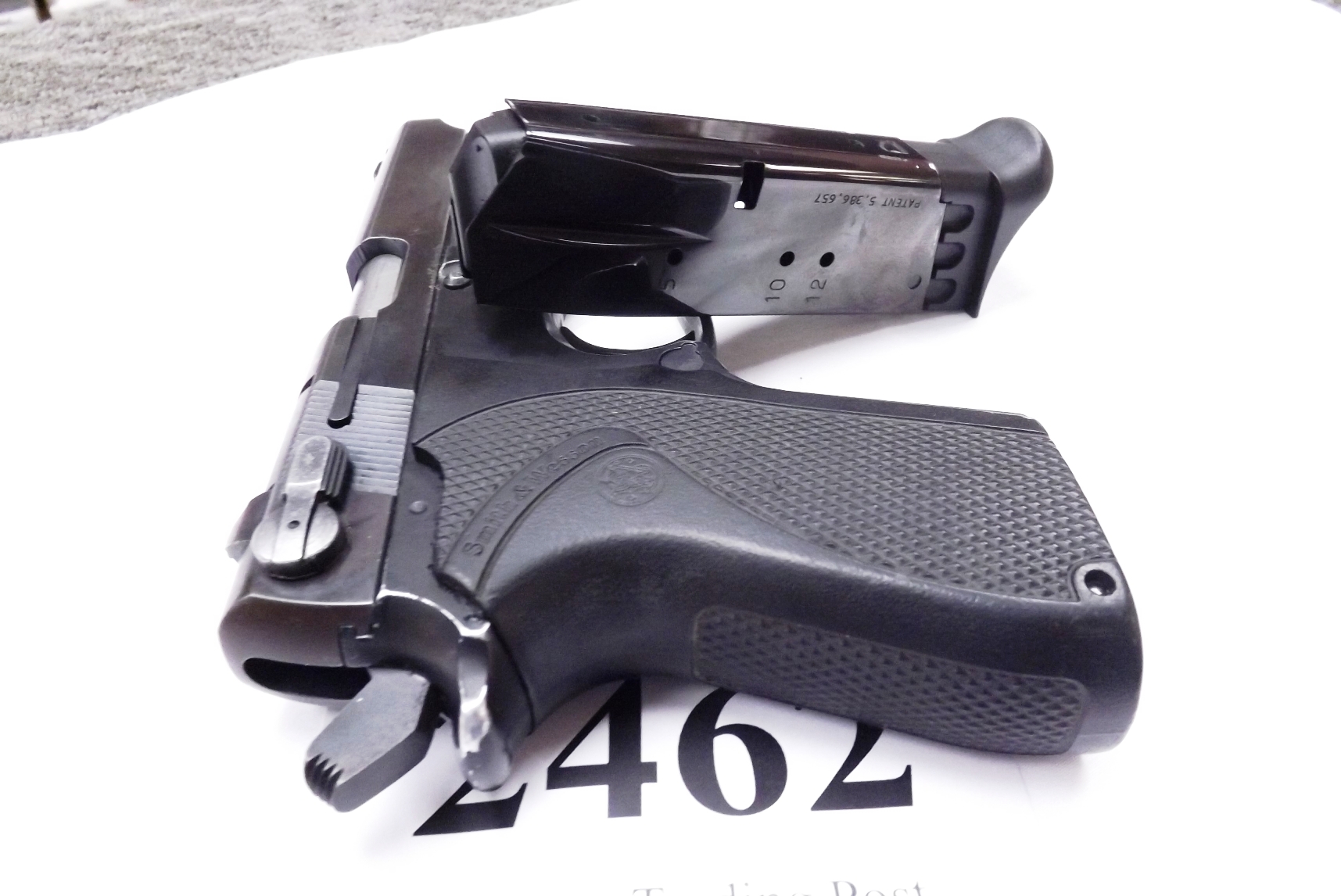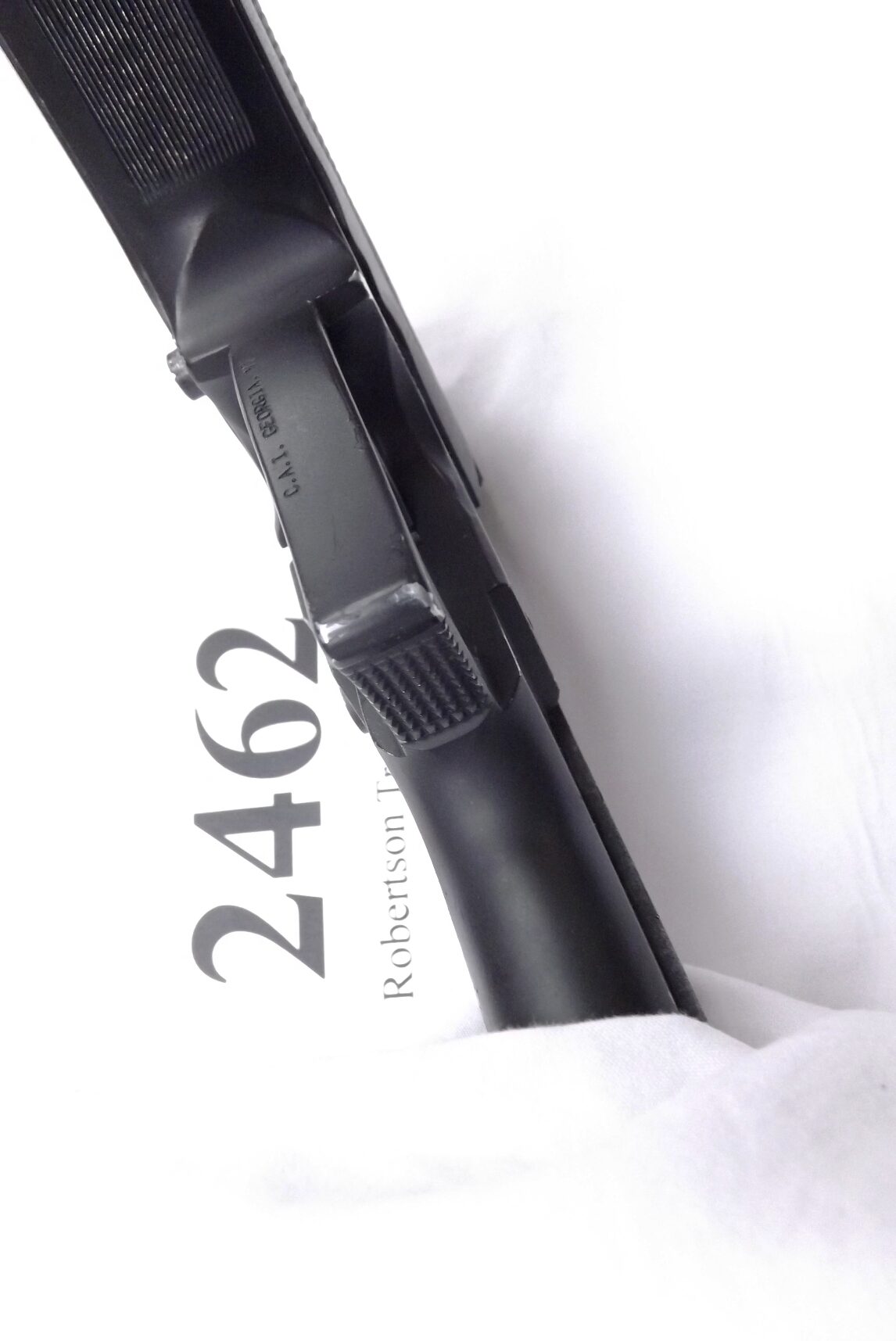 Exact pistol in photos. Model 6904, Sig P229 class, only with safeties. TCS serial prefix = 1989. Traditional hammer fired double / single action compact semi auto pistol. Stainless ball joint 3 1/2 inch barrel in steel slide with steel .362 smooth trigger, .262 factory bobbed hammer, steel levers and internal parts in an alloy frame with square guard. 3 dot rounded sights. Grips, plunger bushing, mag floorplate and follower are polymer. 7 inches overall length, 5 height, and .925 slide thickness. 27 ounces empty. DA pull 11 lb; single 6 1/2 lb 2 stage. Ambidextrous safety / decocker, with magazine and firing pin safeties. Black poly grip. 9mm, with 12 shot pre-ban factory magazine. Matte blued slide & levers; semi gloss black anodized frame. Domicile was with the civilian police in the Land of Israel, attest the importer mark on the trigger guard. Surface detractions are moderate, principally edge and lateral wear; and finish freckles. We rate it as Good, perhaps Very Good, 70 to 75 percent, but photos ought to suffice. We estimate fired fewer than 500 times. No CA MA civilians. 10 round magazine for civilians in CT, DC, HI, NJ, NY, RI, WA. Add new Mec-Gar 10 or 12 round mags; $23 each; correct stainless 12 rounders $23 each; extended 15 shot PGS or 17 rd RTP $23.90; 15 rd RTP $23.90 – no extra shipping charges.