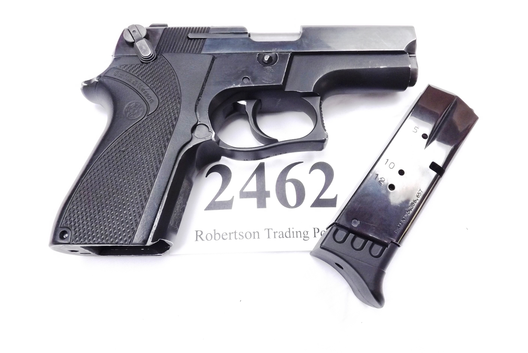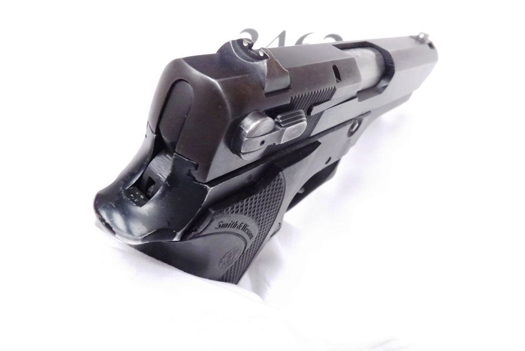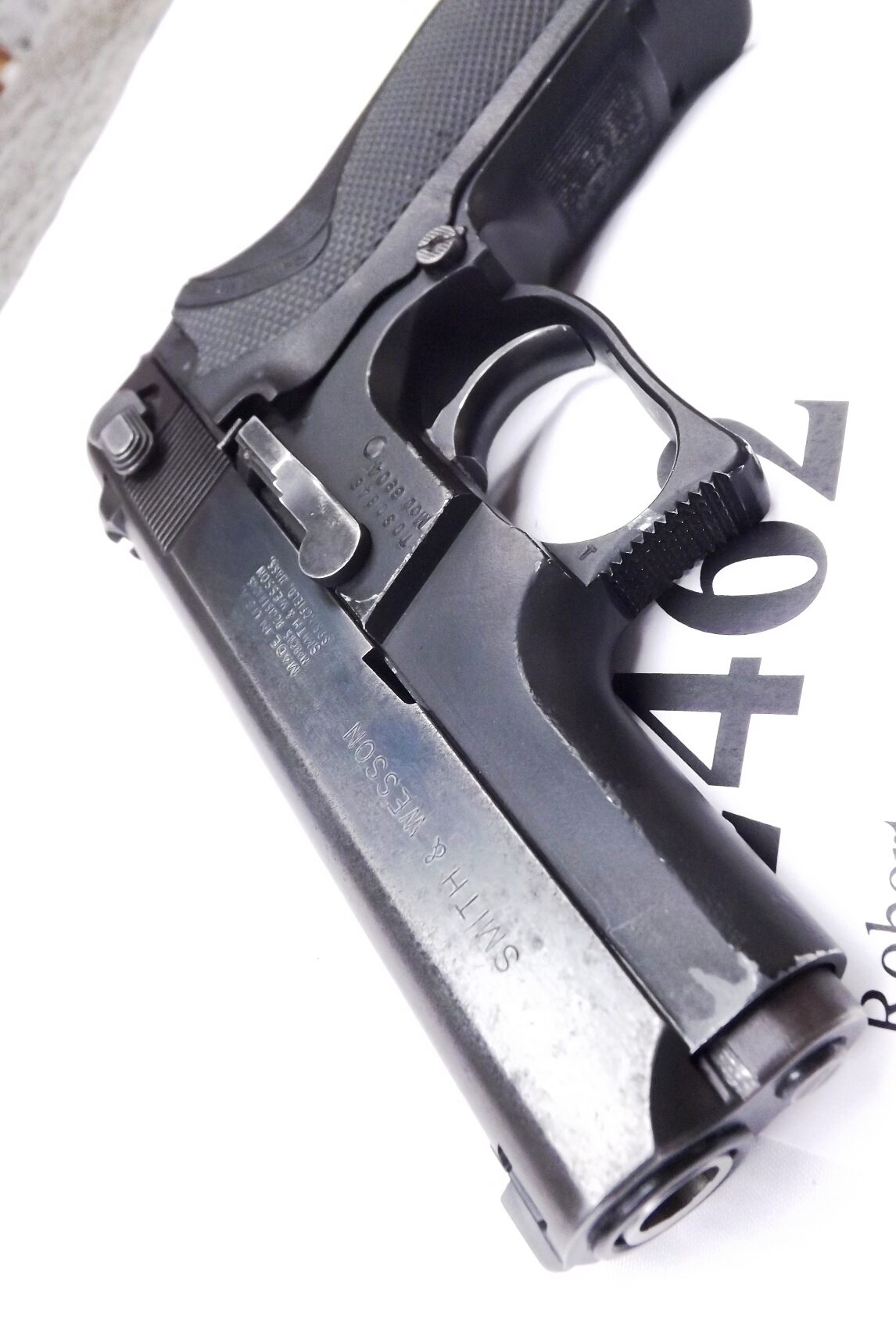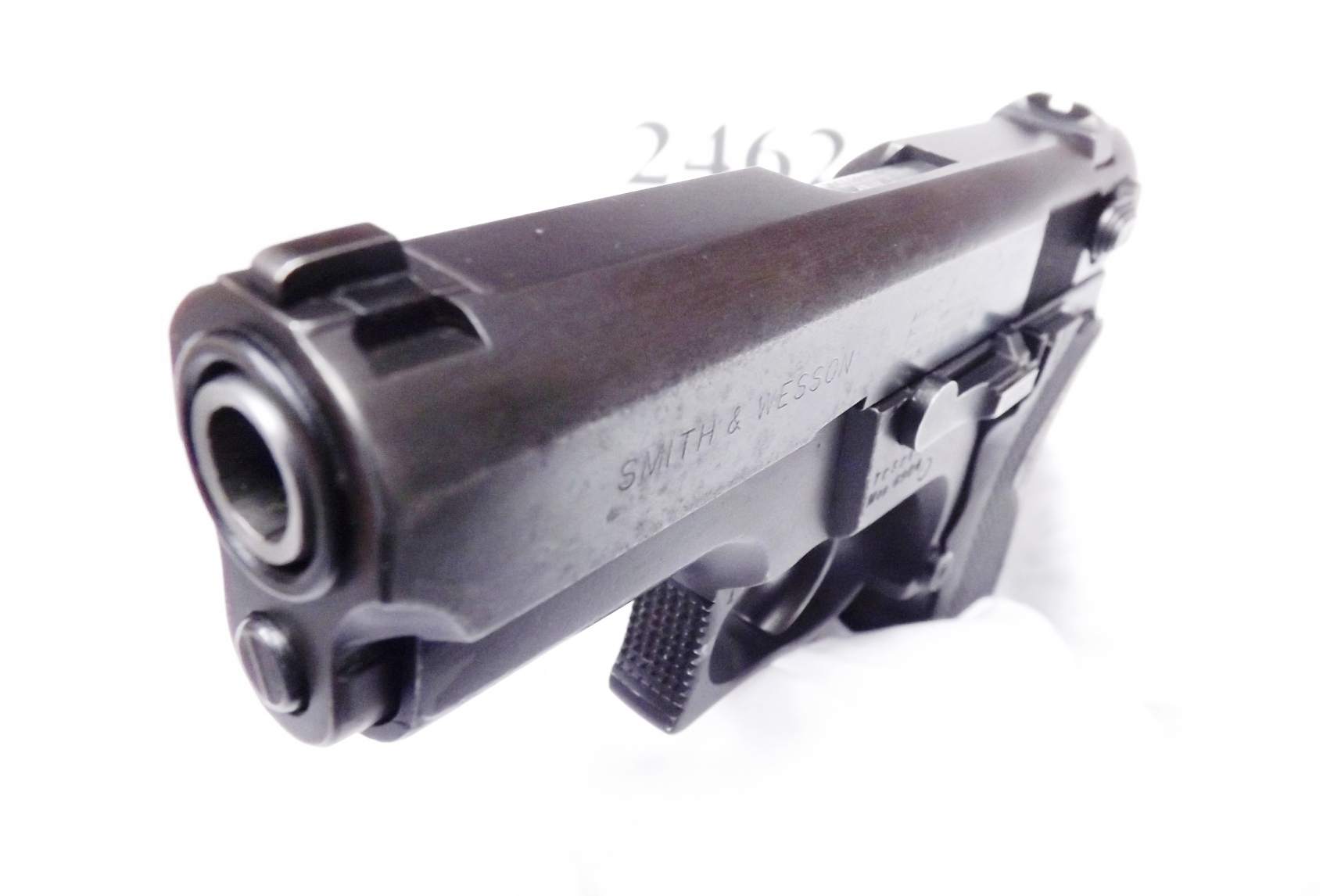 Exact pistol in photos. Model 6904, Sig P229 class, only with safeties. TCS serial prefix = 1989. Traditional hammer fired double / single action compact semi auto pistol. Stainless ball joint 3 1/2 inch barrel in steel slide with steel .362 smooth trigger, .262 factory bobbed hammer, steel levers and internal parts in an alloy frame with square guard. 3 dot rounded sights. Grips, plunger bushing, mag floorplate and follower are polymer. 7 inches overall length, 5 height, and .925 slide thickness. 27 ounces empty. DA pull 11 lb; single 6 1/2 lb 2 stage. Ambidextrous safety / decocker, with magazine and firing pin safeties. Black poly grip. 9mm, with 12 shot pre-ban factory magazine. Matte blued slide & levers; semi gloss black anodized frame. Domicile was with the civilian police in the Land of Israel, attest the importer mark on the trigger guard. Surface detractions are moderate, principally edge and lateral wear; and finish freckles. We rate it as Good, perhaps Very Good, 70 to 75 percent, but photos ought to suffice. We estimate fired fewer than 500 times. No CA MA civilians. 10 round magazine for civilians in CT, DC, HI, NJ, NY, RI, WA. Add new Mec-Gar 10 or 12 round mags; $23 each; correct stainless 12 rounders $23 each; extended 15 shot PGS or 17 rd RTP $23.90; 15 rd RTP $23.90 – no extra shipping charges.